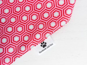 The labels are made of soft cotton and are double-sided. The labels are white with a black paw print and the text “Handmade with love”.